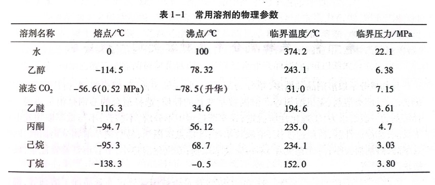 CO2的临界温度为31℃,临界压力为7.15MPa,临界密度为469kg/m³,所以,超临界CO2萃取须在31℃以上,但是为了提高萃取能力,一般要对超临界温度点的CO2流体继续加压到20MPa甚至50MPa,提高流体密度,从而提高其萃取大分子成分的能力。下表是几种常见溶剂的无力参数,供参考。